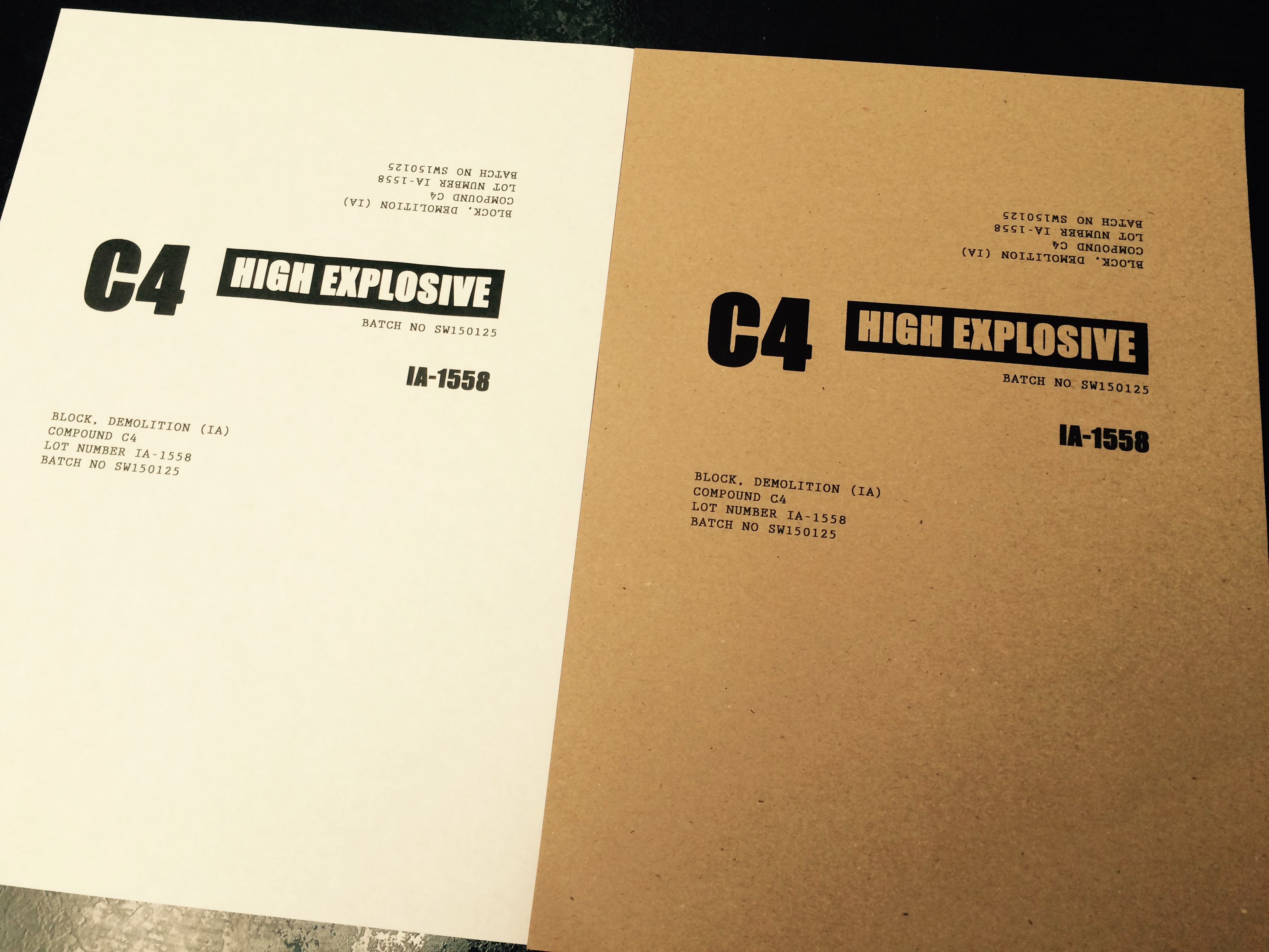 Begin by mocking up your C4 packaging design. This doesn’t have to be a work of art, in my opinion the simpler the better. The blocks of clay intended for use could be comfortably wrapped in a sheet of A4 paper, all I needed to do was measure the sides and position the design accordingly.